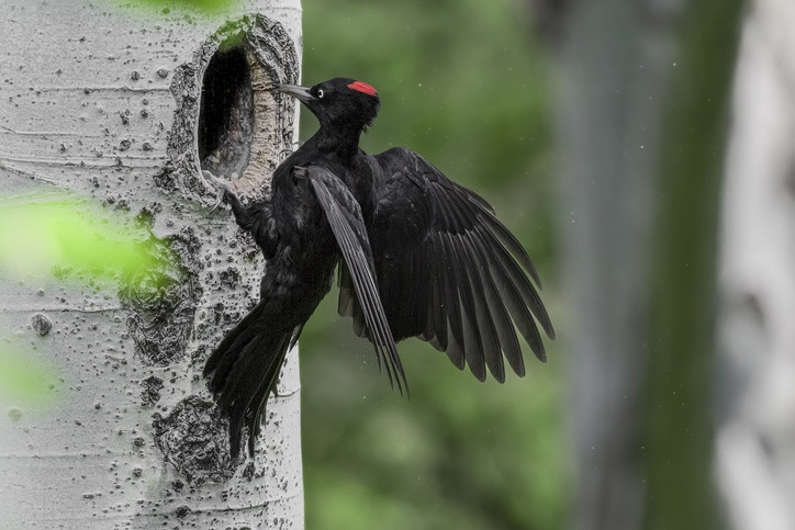 Characterised by its striking all-black plumage and a vibrant red crown in males, this large woodpecker is notable for its impressive size and powerful bill. The Black Woodpecker primarily inhabits mature coniferous and mixed forests, where it excavates large holes in tree trunks to find insects and larvae, making it an essential player in forest ecology.