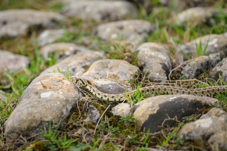 This striking snake is easily identifiable by its distinctive pattern, characterised by dark, elongated spots resembling a leopard's coat, set against a light grey or yellowish background. Typically inhabiting rocky and dry areas, as well as sparse forests, it preys on small vertebrates, including rodents and lizards.