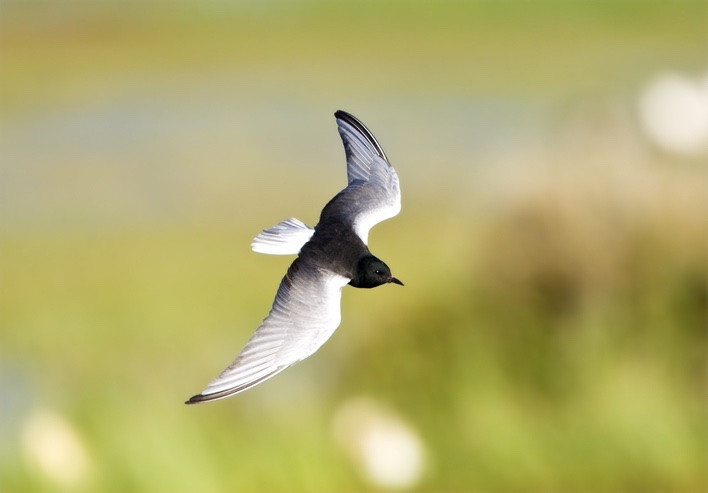 Chlidonias leucopterus, commonly known as the White-winged Tern, is a striking bird with a black cap, white body, and distinctive white patches on its wings.