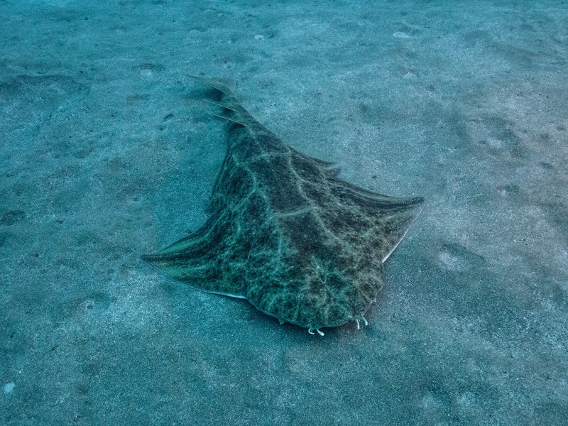This species can be identified by its broad and stout body, conical barbels, thornless back (in larger individuals), and grayish or brownish dorsal coloration with a pattern of numerous small light and dark markings (that is more vivid in juveniles).